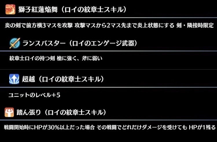 エンゲージ ロイちしき@ 有難いことに頻繁に出てきてくれたので、直近のものだけ纏めてみました。キャラ説明等画像に無い分が出てきたら改めて新規で纏めます獅子紅蓮焔舞のアイコンは燃え盛る炎の軌跡にも、喰らいかかる獅子の表情にも見えるのが凄い